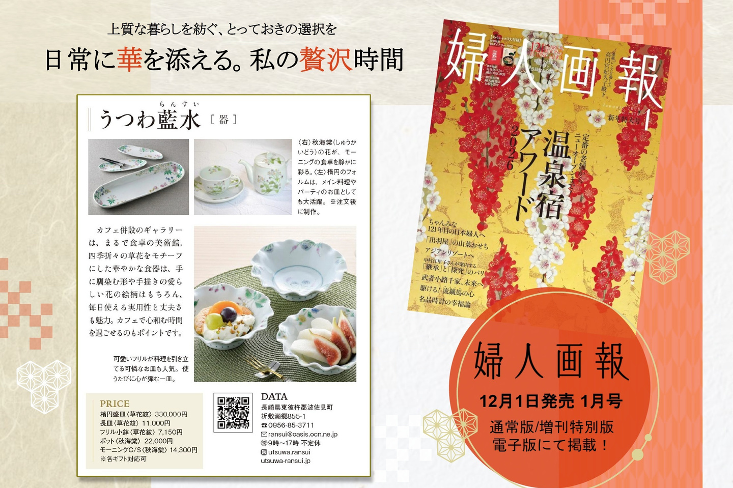 婦人画報掲載のお知らせ12月1日発売1月号に藍水のうつわが掲載されます。是非、書店等にてお手に取って御覧ください。 お申し込みはこちらから 波佐見町ふるさと納税特設サイト 楽天ふるさと納税 2025 出展情報 コンベックス岡山 12/11~15 ギャラリーにはCafeを併設しておりますので、ゆっくりおくつろぎください。 藍水へのアクセス>> 藍水webショップ>> instagram LINE公式 コンタクト 長崎県東彼杵郡波佐見町折敷瀬郷855-1 mail: ransui@oasis.ocn.ne.jp Tel : 0956-85-3711 ページトップへ